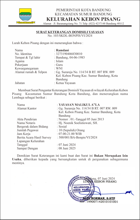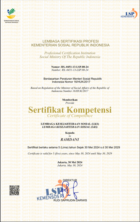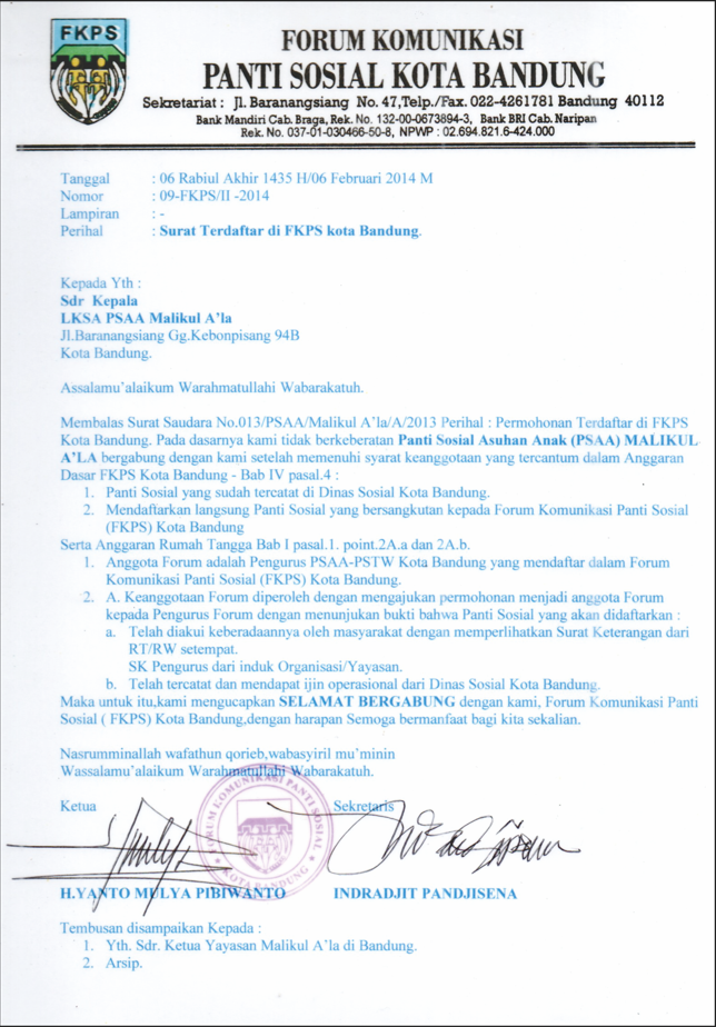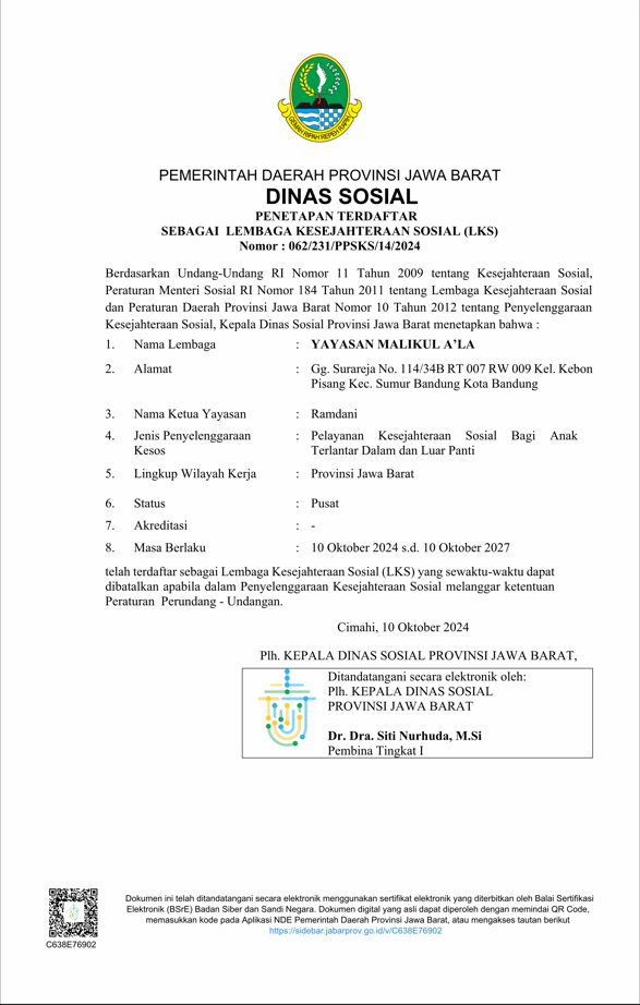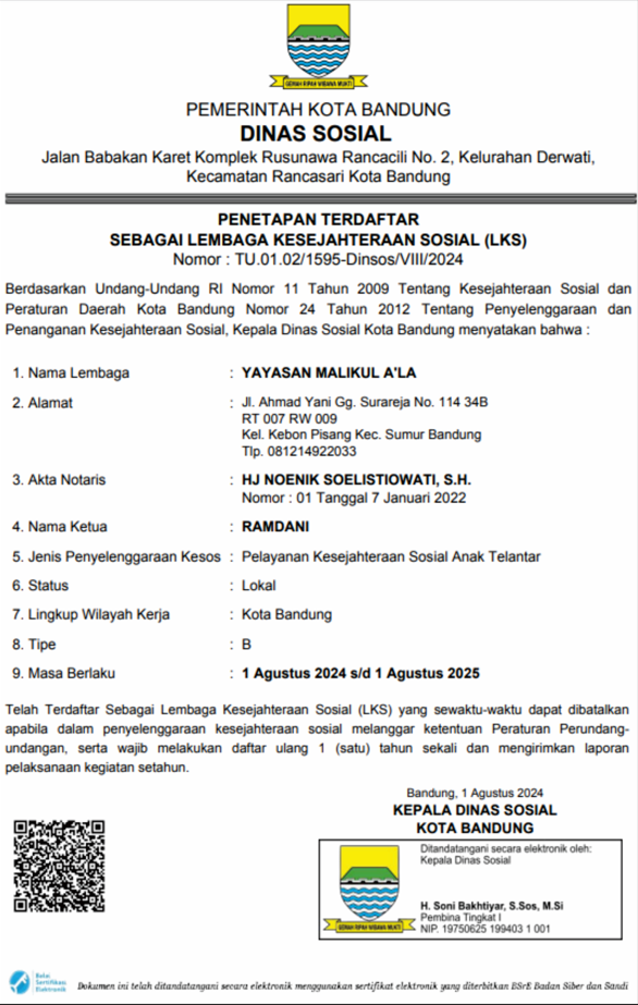Legalitas Lembaga Ayo dukung lembaga sehat yang ✅ Terverifikasi Terakreditasi Terkini KEMENKUMHAM RINOMOR AHU.0000264.AH.01.05 TAHUN 2022 (VERIFIED✅) AKTA NOTARISHJ. NOENIK SOELISTIOWATI, SH. SP1 NO.1 TAHUN 2022 (VERIFIED✅) SK DOMISILI YAYASANNo. 103/SKDL-BONPIS/VI/2024 KELURAHAN KEBON PISANG (UPDATED ✅) SK RELAWAN SOSIALLEMBAGA SERTIFIKASI PROFESI RS.-0451-13-LSP.00-24 (Dede Zaenal Mutakin) (VERIFIED✅) SK DINSOS JABARNO.062/231/PPSKS/14/2024(UPDATED✅) SK DINSOS KOTA BANDUNG NO:TU.01.02/1595-DINSOS/VIII/2024 (UPDATED✅) AKREDITASI LKSANo.0786.SA-LKS.B/2024 KEMENSOS RI (UPDATED✅) SK FKPS KOTA BANDUNGNO. 09-FKPS/II-2014(VERIFIED✅)